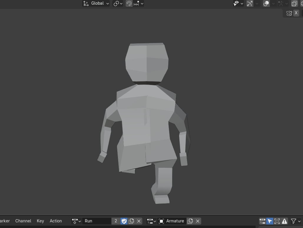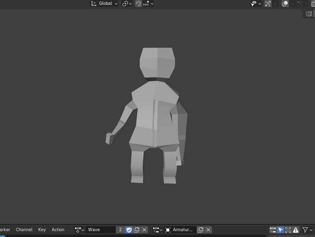 Again follow Imphenzia's third tutorial on animation (as you can see I found his videos very helpful) I moved over to the Animation tab and started with making the Idle, waving and running animation. The ideal one was pretty basic, and just involved turning on Auto-Keying, moving the torso armature/bone down a little and moving the arms just a little bit. It sounds simple but probably took me a lot longer than it should have. Making the wave and running one was basically the same process but a lot more time consuming and difficult.